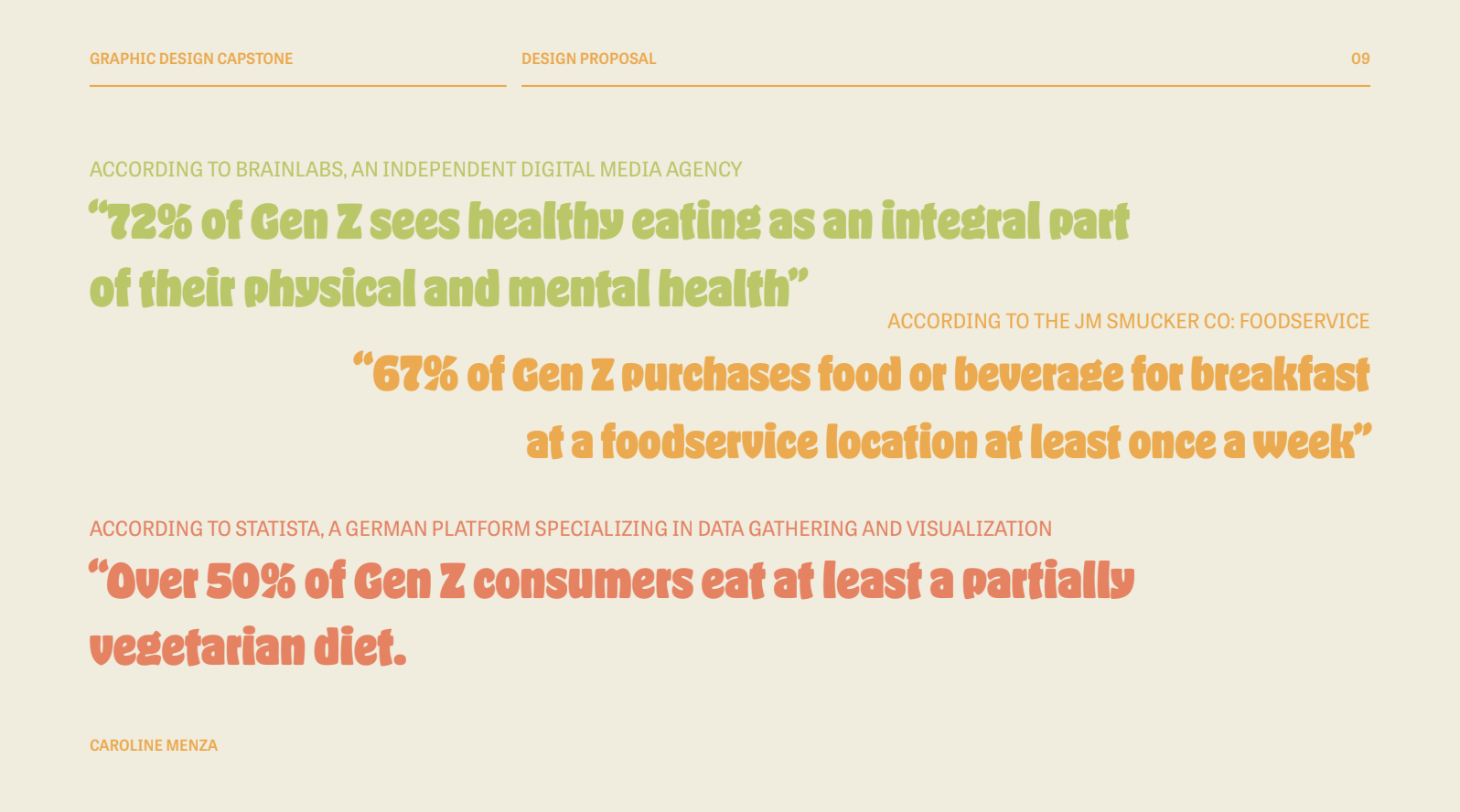 Extensive research into Gen Z eating patterns and healthy lifestyle choices guided my selection of specific ingredients and flavors for the menu. Additionally, I explored social media marketing trends and successful CPG ads to envision an appealing packaging design.
